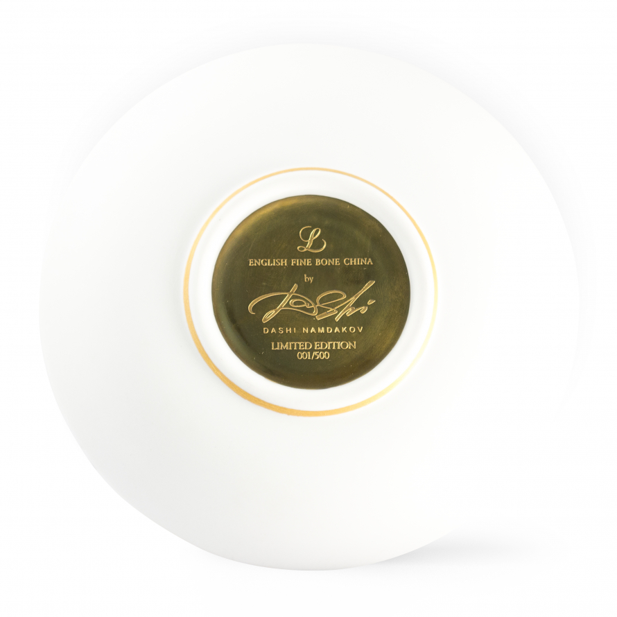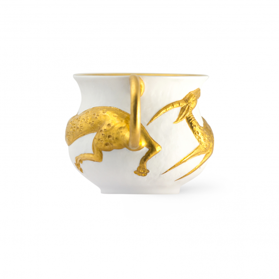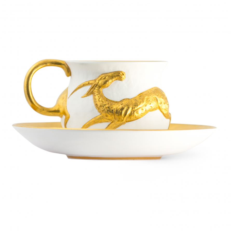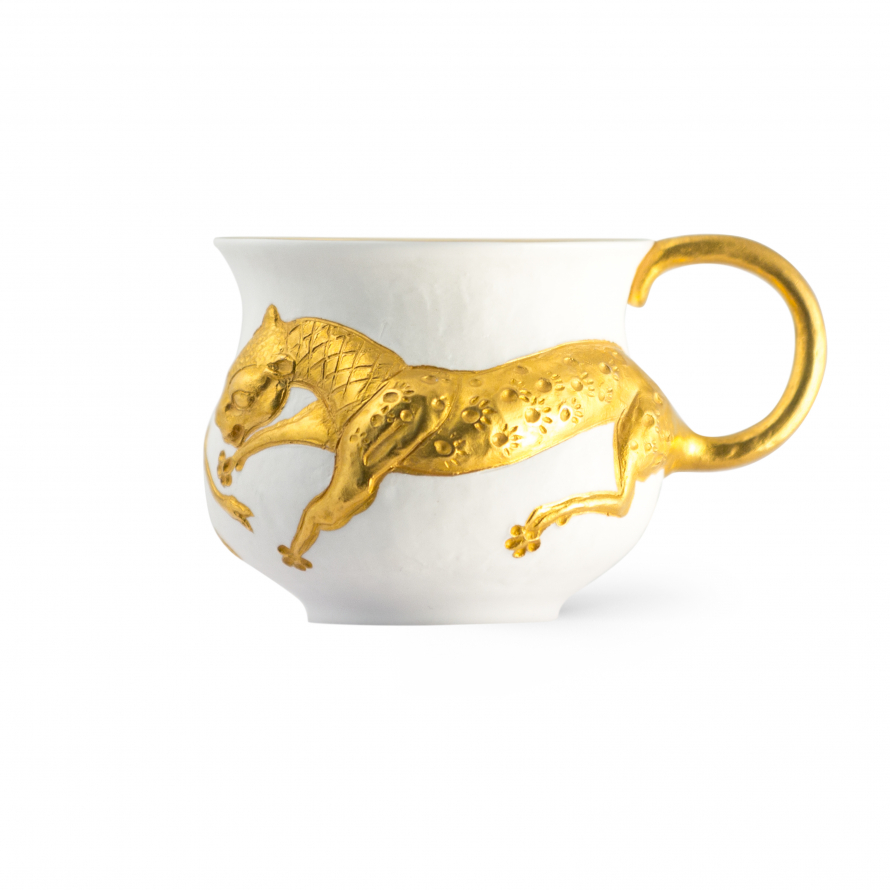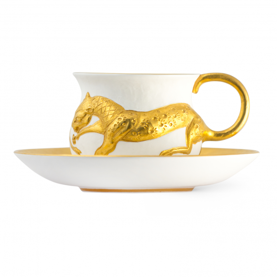 Костяной фарфор с изображением сцены охоты хищной кошки «оживает» под рукой мастера. Покрытая вручную 24-каратным золотом чайная пара превращается в настоящее произведение искусства.
